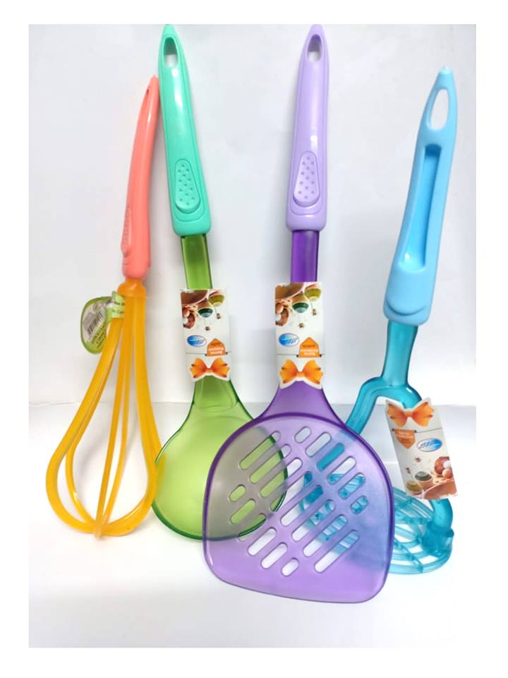 طقم بلاستيك 4 قطع مكون من هراسه بطاطس + مغرفه _ مقصوصه + مضرب بيض